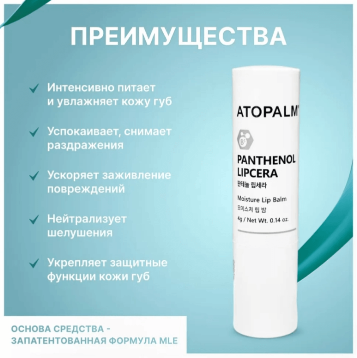 Бальзам Atopalm Panthenol Lipcera восстанавливает сухие, повреждённые и обветренные губы: смягчает и питает, избавляет от чувства стянутости, ускоряет заживление.