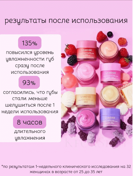 LANEIGE – маска для губ, которая имеет уникальную запатентованную технологию увлажнения «Moisture Wrap», благодаря чему она действует эффективнее, чем аналогичные средства.