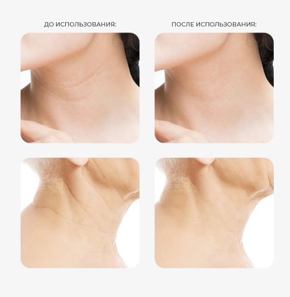 Результат: Кожа шеи и декольте становится подтянутой, плотной и гладкой. Глубина морщин заметно сокращается, исчезает дряблость, а тон кожи становится ровным и сияющим.