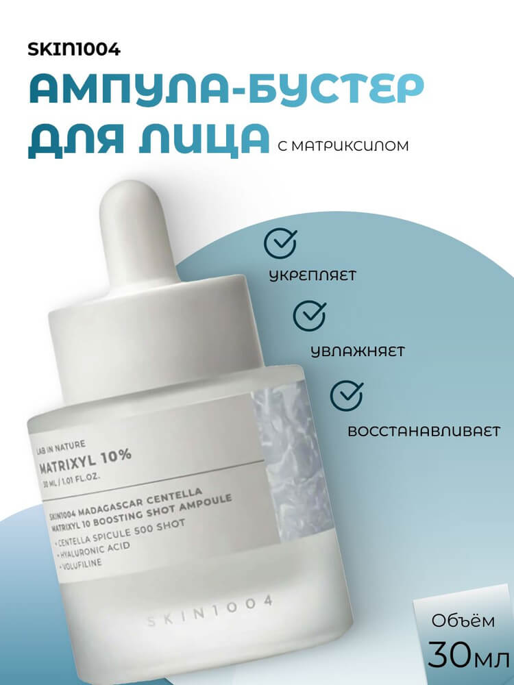 Ампула-бустер SKIN1004 Madagascar Centella Matrixyl 10 Boosting Shot Ampoule направлена на укрепление кожи и повышение её тонуса. Обеспечивает интенсивное увлажнение, способствует удержанию влаги в эпидермисе, смягчает огрубевшие участки. Восстанавливает гидролипидную мантию, придаёт упругость, выравнивает текстуру и тон, возвращает естественное сияние.