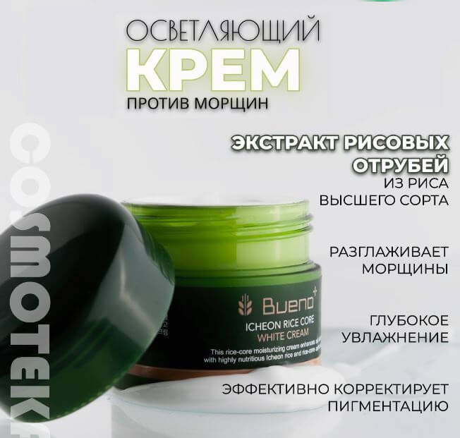 Веганский крем Bueno Icheon Rice Core White Cream восполняет недостаток влаги, за счёт чего поддерживает эластичность кожи, устраняет шелушение и сухость, укрепляет защитный барьер.