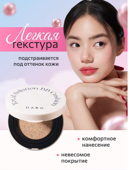 Кушон тональный для лица имеет легкую текстуру. Вы сможете создать идеальную основу под любой макияж — от повседневного до вечернего. ББ крем тональный в кушоне насыщает кожу влагой и помогает улучшить ее текстуру. Подходит для всех типов кожи. Применение: наносите на очищенную кожу лица с помощью прилагающейся подушечки для равномерного распределения и стойкого результата. Позвольте себе насладиться идеальным сочетанием стойкого покрытия, интенсивного увлажнения и высокой защиты в одном продукте! Рекомендуется к использованию в комплексе с серией корейской косметики DABO / Дабо.